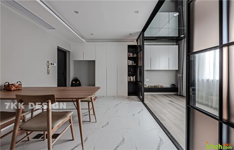 拉開玻璃移門,客餐廳面積瞬間變大。餐廳餐桌椅后面墻上一塊圓形藝術(shù)裝飾品作為點(diǎn)綴,剩下的空間盡量留白,多份想象,達(dá)到極簡的空白藝術(shù)。