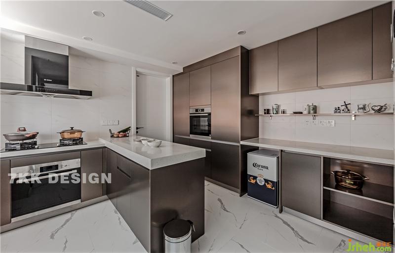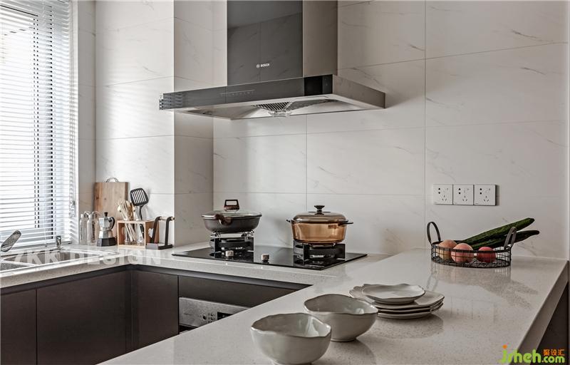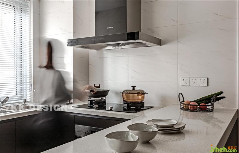 廚房打破原有封閉的空間,充分利用過道,打造開放式廚房,空間上顯得更加通透,同時(shí)擁有更開闊的操作空間。吧臺(tái)連接廚房操作臺(tái),U字型設(shè)計(jì),最大化利用空間。吧臺(tái)右側(cè)選用科勒的整體櫥柜,采用嵌入式微波爐,烤箱,讓整體空間更干凈整潔。