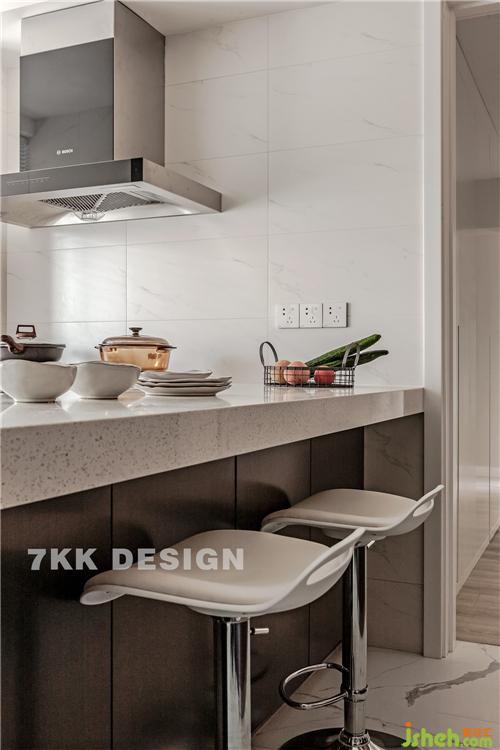 吧臺(tái)采用水磨石臺(tái)面,燒完的飯菜隨手?jǐn)[放很方便。臺(tái)面下方做成柜體形式,為小小的廚房空間增加更多的收納功能。簡約高腳凳搭配,早晚餐可以很方便在吧臺(tái)解決。