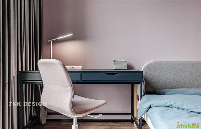 床頭寫字桌,上面一盞簡約的臺燈裝飾,粉紅辦公椅靈活自由,給孩子帶來更輕松的學習環(huán)境。