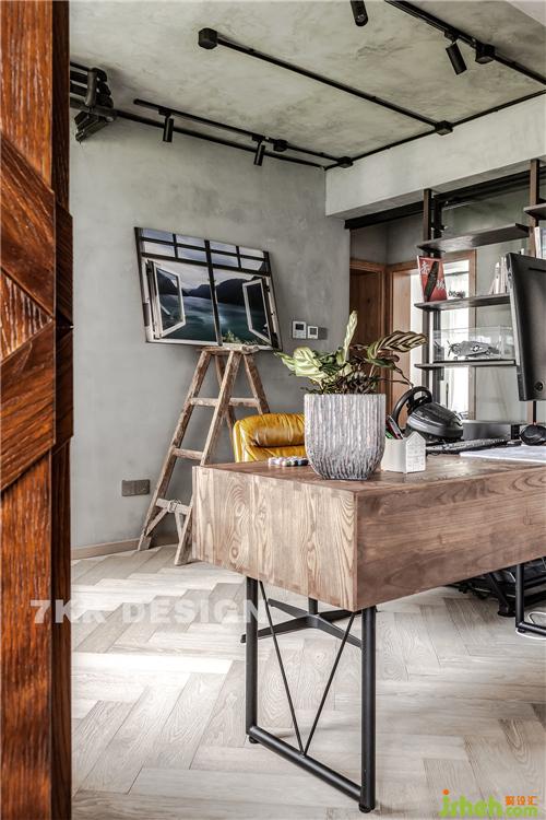 書房和過道一側(cè)的非承重墻也敲掉,用鐵藝和板式結(jié)合的開放架來做過道的隔斷,正好能放男主人的手工藝術(shù)品。同時(shí)彌補(bǔ)過道采光的不足。