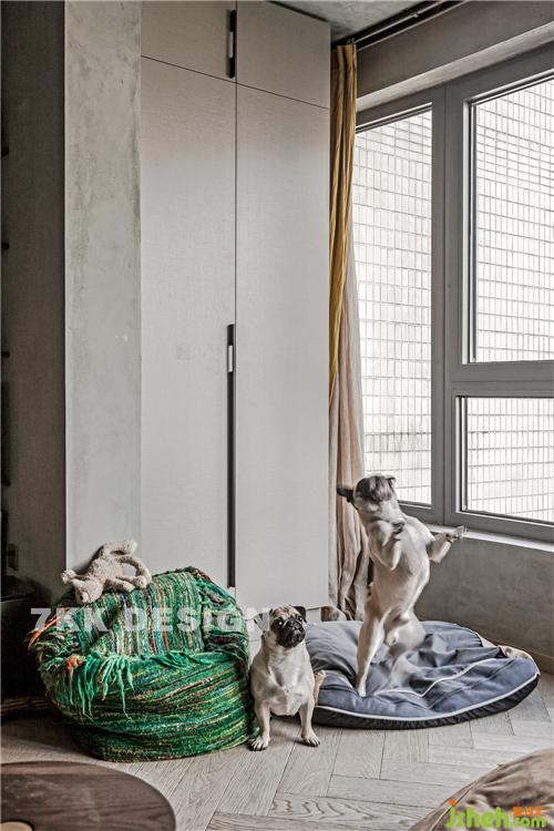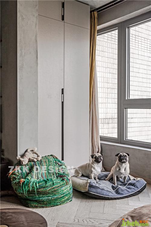 好個(gè)性的懶人沙發(fā)袋,靠墻做了一排收納柜.