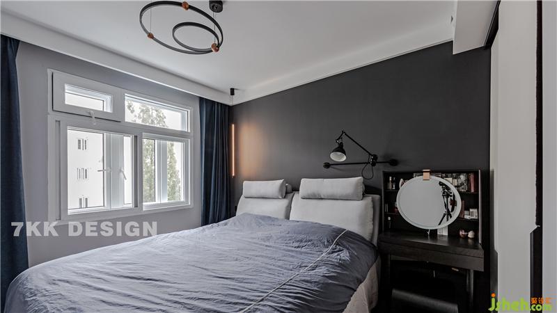 臥室一角選擇成品床頭柜,主要作為女業(yè)主的化妝桌,上面擺滿了女主人的化妝用品。個性的圓形鏡子搭配,很有意境。墻面?zhèn)€性的可以自由調(diào)節(jié)角度的臺燈,為看書或者化妝補(bǔ)光使用。