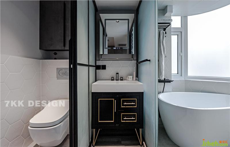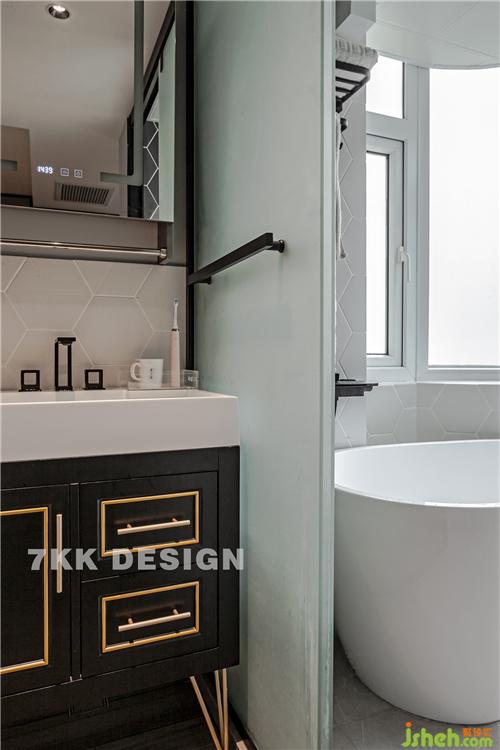 改變衛(wèi)生間的門的位置,衛(wèi)生間設(shè)計(jì)成現(xiàn)代比較流行的三分離式,馬桶,淋浴,干區(qū)獨(dú)立分開,使用起來也比較方便。 干區(qū)選擇黑色基調(diào)金屬元素勾勒的臺盆柜,超高顏值,時(shí)尚而精致,也方便打理。鏡子的搭配也很個性,正面可以顯示正常的時(shí)間和溫度,打開鏡子背面可以成小型收納空間放置日?;瘖y用品。 馬桶和淋浴空間都選擇磨砂玻璃移門,不影響采光,墻面采用白色菱形瓷磚拼接,打造干凈清爽的衛(wèi)生間空間。