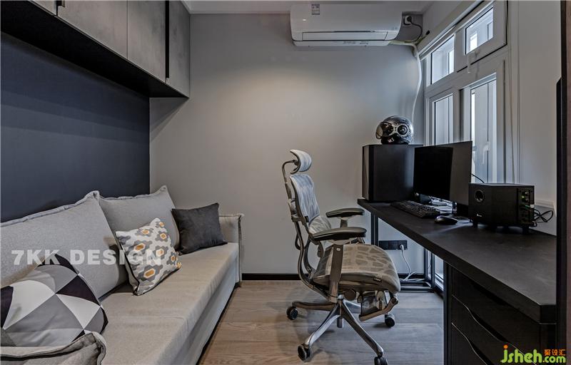 多功能房間書房+客房,靠窗一側(cè)選擇成品書桌,作為業(yè)主平時(shí)工作區(qū),一臺電腦。另一側(cè)靠墻選擇一張折疊沙發(fā),平時(shí)工作累了可以躺一下,或者有客人來也可以臨時(shí)入住。上方上方定制灰色吊柜增加收納功能,沙發(fā)背景墻選擇墻面深藍(lán)灰色調(diào),與沙發(fā)淺灰色墻面白色相協(xié)調(diào),營造一種簡約、寧靜而又品質(zhì)的的多功能辦公休息環(huán)境。