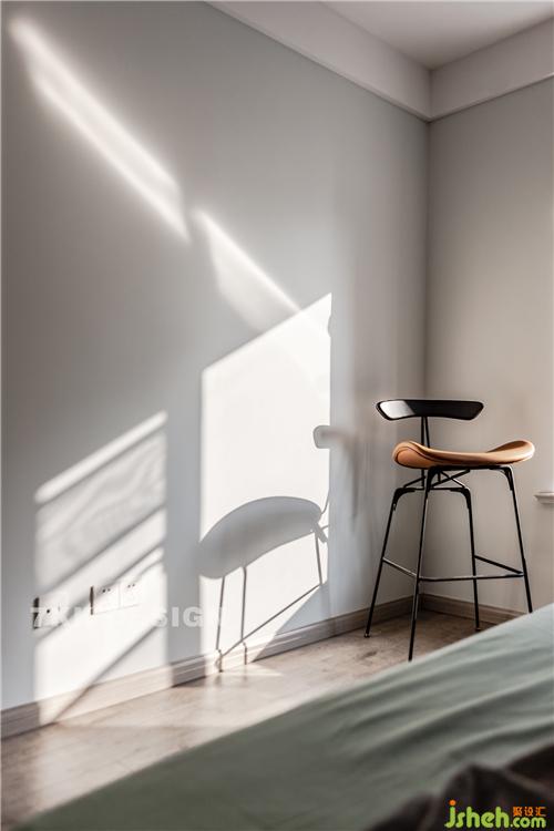 本來床頭設(shè)計師選擇的成品斗柜,業(yè)主暫時還沒買,靠墻角放置一把高腳吧椅,上海裝修設(shè)計簡約的線條在自然光線的照射下,有著強烈的光影效果。