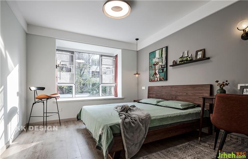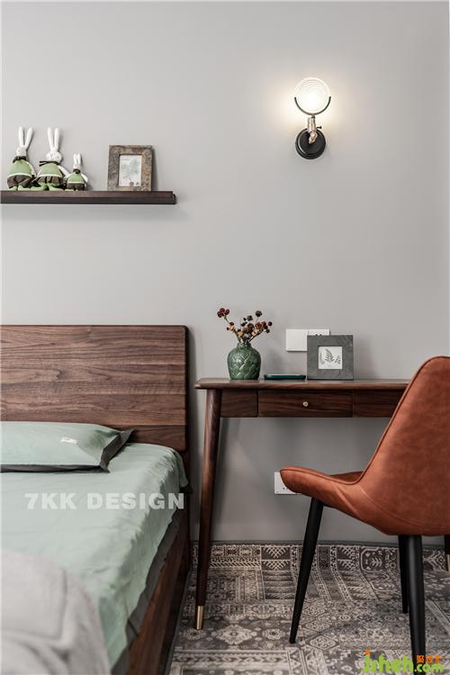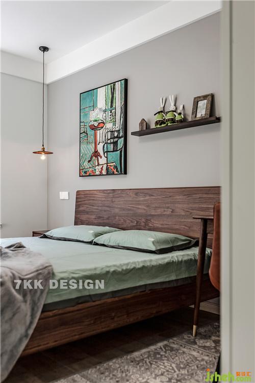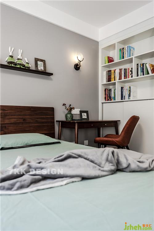 墻面抽象的綠色為主的裝飾畫和綠色的床品相呼應(yīng)。床+床頭柜+書桌和客廳斗柜餐廳餐邊柜都是成品選樣,營造復古的文藝感。墻面的隔板裝飾讓床頭背景墻更加豐富立體。上面的一家三口的小白兔玩偶感覺很可愛,很溫馨,讓人內(nèi)心暖暖的。