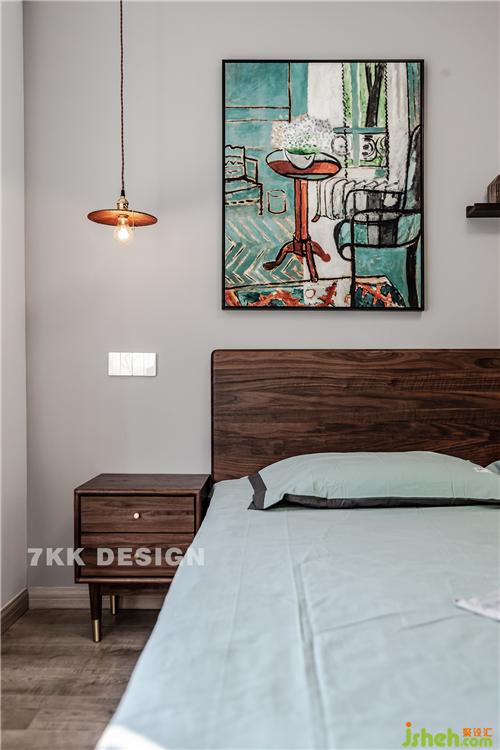 簡約的床頭柜,精致的吊燈,一副裝飾畫,搭配出精致充滿藝術(shù)的床頭一角。