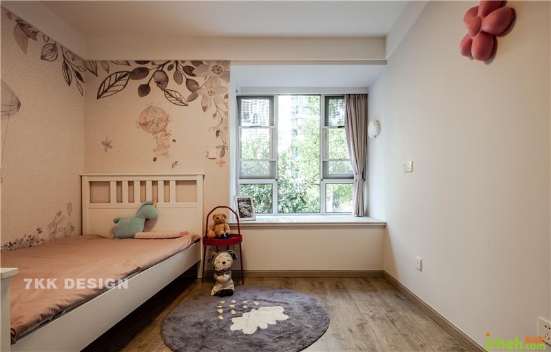 兒童房比較簡約墻面一側(cè)鋪貼充滿童趣的壁紙,右側(cè)墻面白色和紅色花朵形狀的是比較有趣裝飾燈作為點綴。粉色的床品是每個女孩愛的童年色調(diào)。布偶娃娃也是快樂童年不可缺少的伴侶,很溫馨。