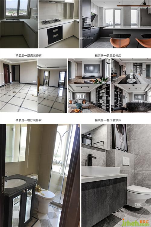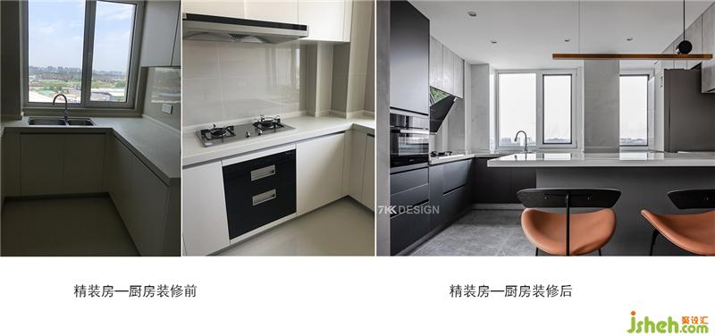 2、廚房原先是封閉式廚房連接著客衛(wèi),改造后的廚房,我們做成了開放式廚房,同時(shí)也把廚房和客衛(wèi)之間的墻體拆除掉了,整體擴(kuò)大了廚房的空間。并設(shè)計(jì)了吧臺,來隔斷廚房和客廳空間,使得整體的空間區(qū)域分明,同時(shí)吧臺也可以做為餐桌使用。