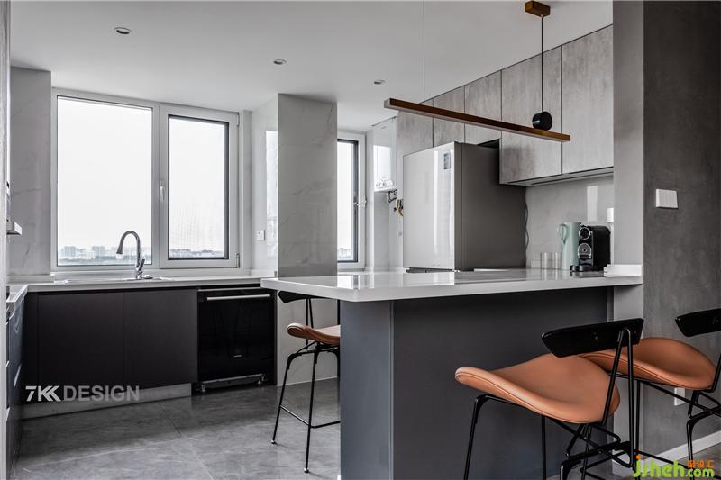 開放式廚房的設(shè)計巧妙利用空間,將實用美觀的吧臺與廚房緊密相連,形成一個開放式的烹飪就餐空間,視覺上更加開闊明亮,心里上,也比局促在幾平米的方寸空間,更要讓人心情舒適。