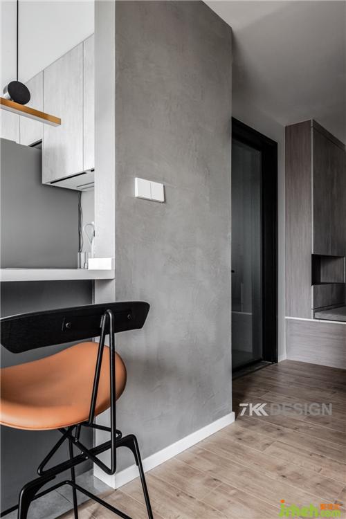 為了使工業(yè)風(fēng)的空間感覺不那么生硬冰冷,吧臺則使用橙色餐椅,用跳色搭配手法來中和整體空間的視覺感覺。