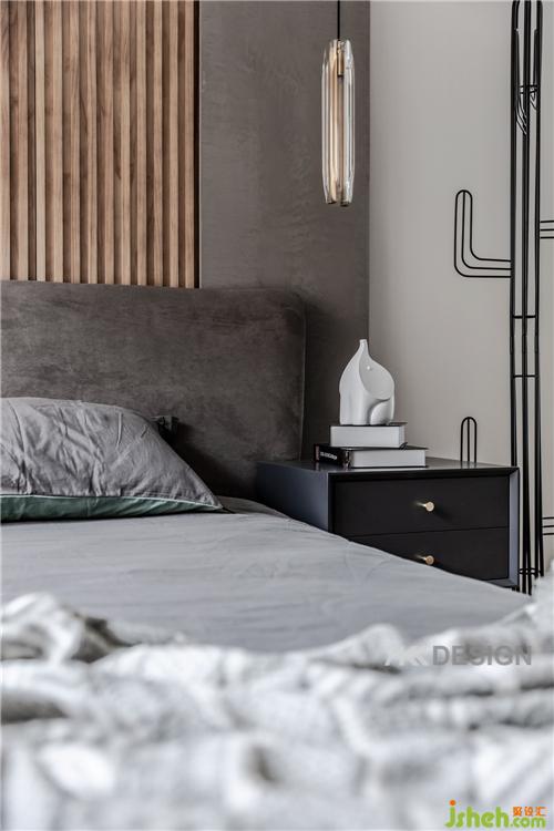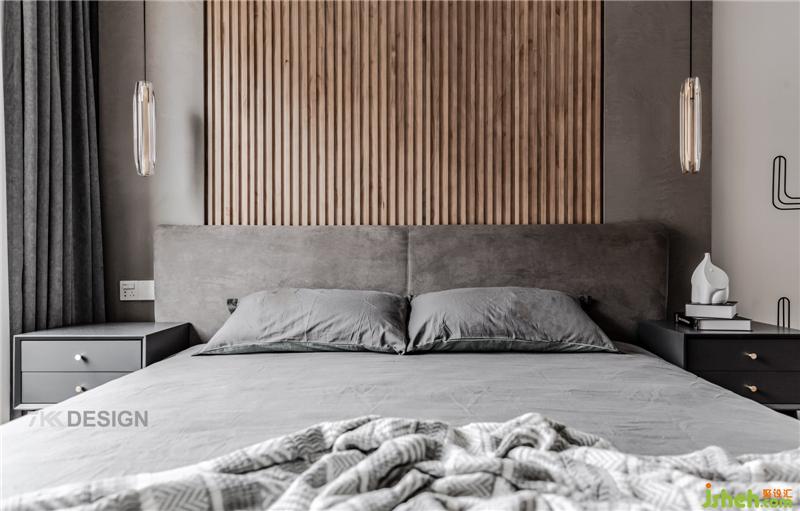 灰色背景墻與線條感的木質(zhì)欄杉背景墻結(jié)合打造質(zhì)感的睡眠空間。