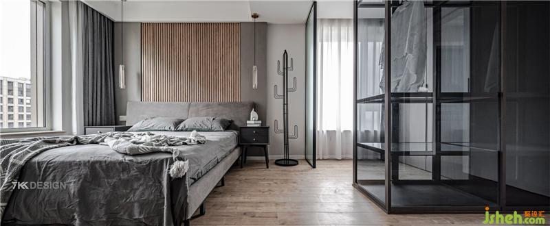 主臥延續(xù)整屋的灰色主色調(diào),床頭背景墻中間用做溫潤質(zhì)感的木質(zhì)欄杉裝飾造型中和臥室的冷色調(diào),兩邊再搭配著金色吊燈,配上灰色系的床品,窗簾,黑色邊框的玻璃衣帽間,打造穩(wěn)重質(zhì)感的睡眠環(huán)境。