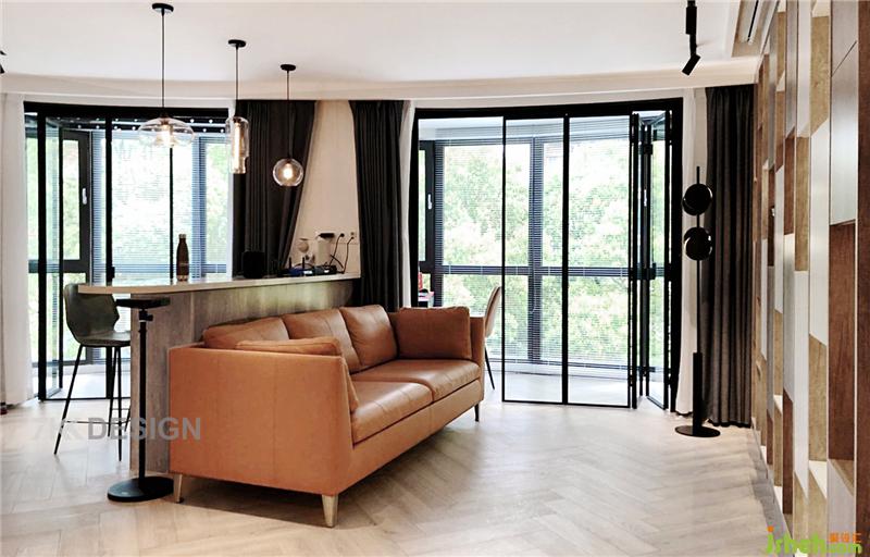 1、為使得原始不規(guī)則的客廳有個比較方正的空間,利用陽臺中間的承重墻作為分隔,和客廳電視背景墻齊平定制一排吧臺,吧臺一側(cè)不規(guī)則弧形元素更具設(shè)計感上海室內(nèi)設(shè)計師。 沙發(fā)背靠吧臺擺放,電視背景墻定制一整面到頂?shù)臅堋R驗闃I(yè)主很少看電視,在書架頂部內(nèi)藏投影幕布,平時看電影時可以放下來使用。這樣吧臺作為隔斷使得客廳空間一份為二,動線更流暢。