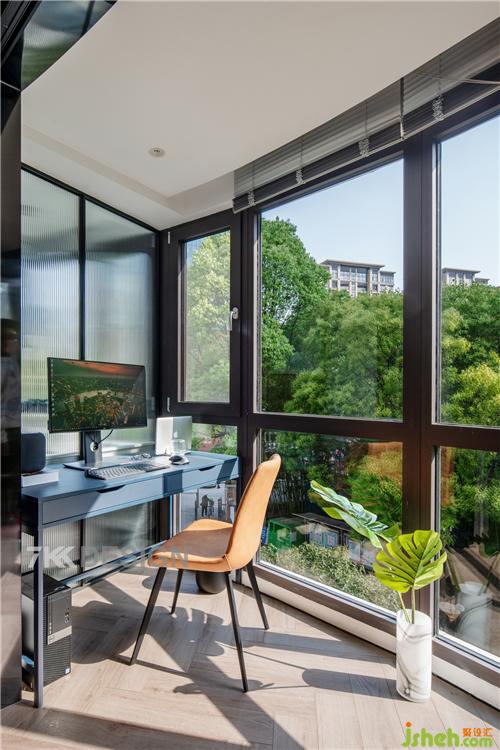 客廳陽臺一側(cè)作為書房使用,陽臺另一側(cè)是晾曬洗衣空間。陽光灑進來,光和影塑造一副時光靜好的畫面。去拍攝時業(yè)主剛好在這里度過他美好的下午時光,打游戲中。在公辦時如果光線很強可以放下百葉窗,視覺效果也很贊。平時晚上男業(yè)主在這辦公也不會打擾到女業(yè)主休息。