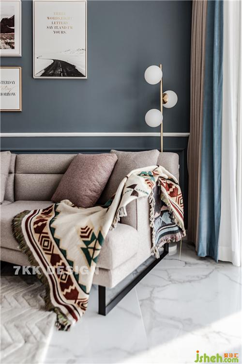 沙發(fā)一角簡易金屬落地?zé)舸钆?,彌補(bǔ)光源的不足,增加層次感和生活儀式感。