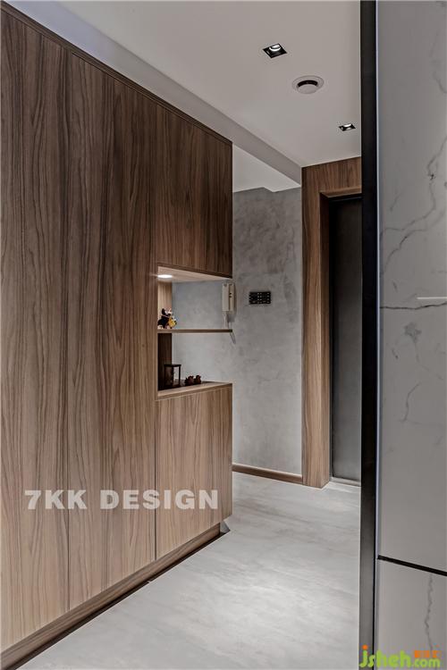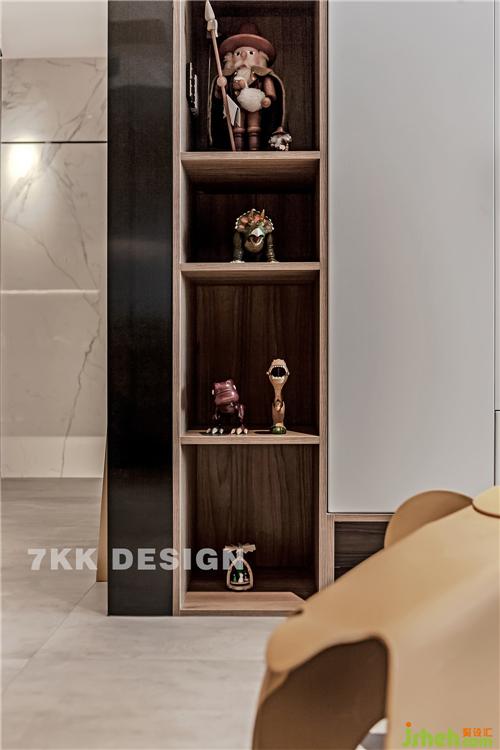 進門玄關(guān),原始戶型進門玄關(guān)比較狹小,把原始廚房一分為二,外側(cè)做了整體的收納玄關(guān)鞋柜裝飾柜一體,里面做一排一字型廚房操作臺面。玄關(guān)鞋柜鏤空設計,空間透明,內(nèi)嵌筒燈,增加光線照明,隨手放置進出的鑰匙包包物品,很方便。