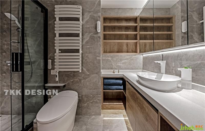 主衛(wèi)獨立出來干濕分離,臺盆馬桶同一空間,淋浴單獨空間。白色洗手臺面,高顏值的臺上盆上海裝修設(shè)計,下方柜體設(shè)計滿足更多的收納功能,上方鏡柜內(nèi)藏更多的是女主人的日?;瘖y用品。一側(cè)鏤空的隔板設(shè)計,增加收納也可以擺放裝飾品也很美觀。