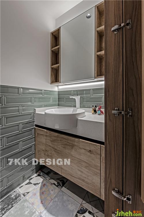 客衛(wèi)保留一個臺盆和馬桶空間,即使很小的空間,設(shè)計上也沒有絲毫懈怠。地面精選的不同色彩圖案瓷磚拼接,半墻淺綠色長形瓷磚拼接,點狀白色洗手臺搭配白色圓形臺盆,臺盆下方柜體增加收納,懸空處理方便打掃。臺盆上方鏡柜鏤空設(shè)計,鏡柜上下方嵌入燈帶,增加光線,整體打造精致干凈清爽的客衛(wèi)空間。
