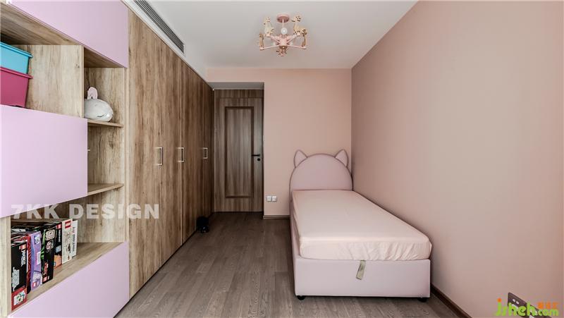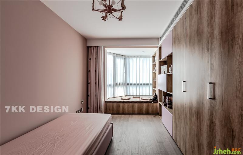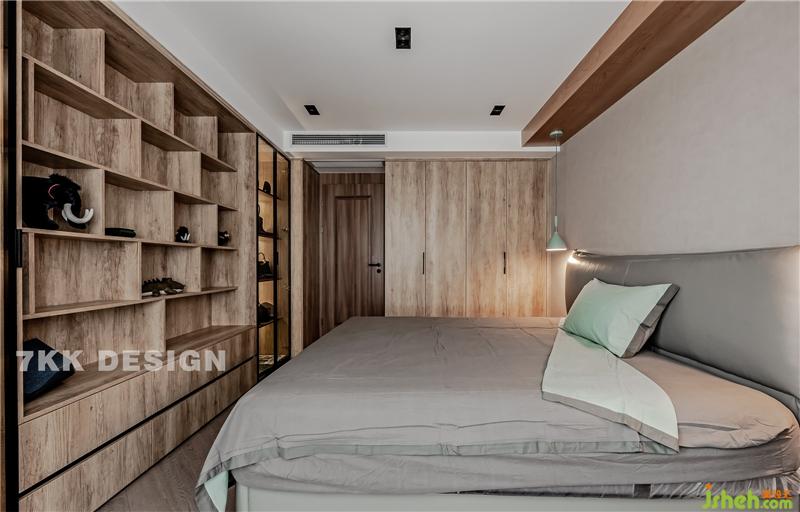 床尾裝飾柜中間上方鏤空設(shè)計下方抽屜增加更多的收納功能,裝飾性也很強,兩邊柜體選用透明玻璃柜門,內(nèi)嵌燈帶,里面大都擺滿了主人的包包作為裝飾。床一邊靠墻定制頂衣柜,柜門木飾面顏色與臥室門及延伸的墻面木飾面顏色形成一深一淺的色調(diào)對比,又具有線條感。