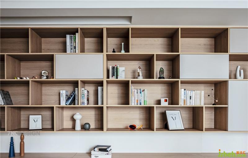 4、把兒童房和客廳的墻體敲到陽臺(tái)的承重墻位置,擴(kuò)大兒童房的面積,定制一面到頂?shù)囊鹿褡鳛閮和渴占{使用。接近客廳陽臺(tái)一側(cè)墻面定制書柜收納使用,增加了更多的儲(chǔ)物空間。