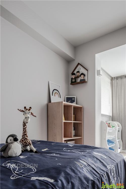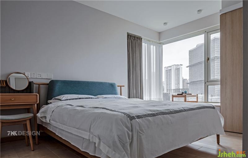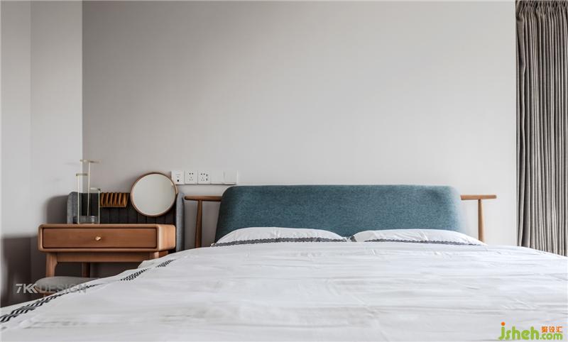 主臥以灰色調(diào)為參考來(lái)布置,大面積的白灰木色作為基調(diào),使其成為讓人放松的休憩空間;自然簡(jiǎn)約的梳妝臺(tái)和精致的茶幾,點(diǎn)綴其中的藍(lán)色床頭,讓主臥從單調(diào)乏味中跳出來(lái),很好地展現(xiàn)業(yè)主的有趣的個(gè)性和生活品味。