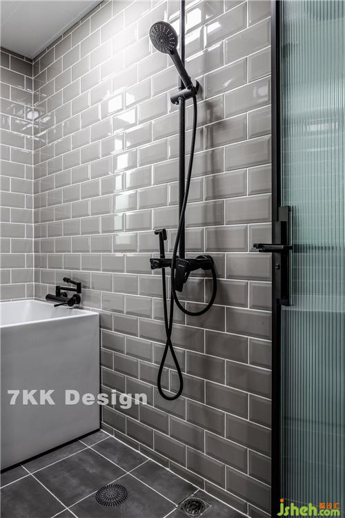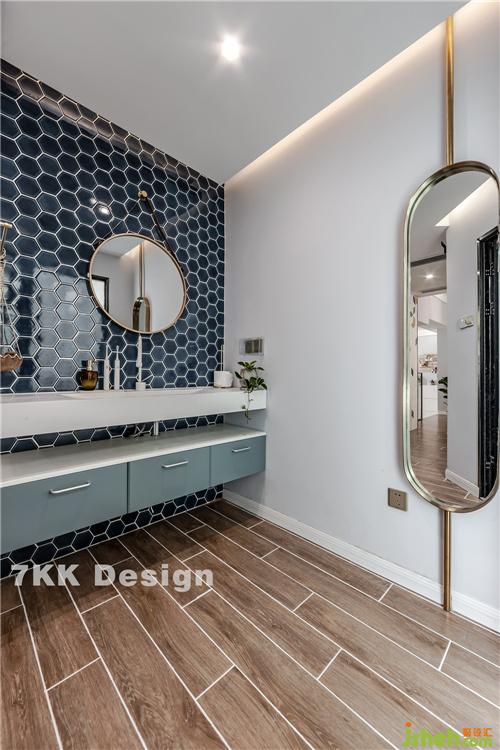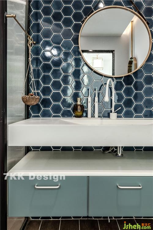 整個洗漱臺的亮點(diǎn),在于它的水槽,從兩邊開始傾斜,極具設(shè)計(jì)感。背景選用菱形墨藍(lán)色磚塊鑲嵌,配合些許的金屬色點(diǎn)綴,看上去更帶著一絲輕奢感。