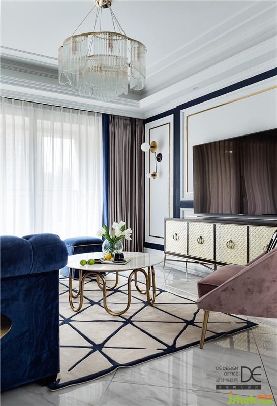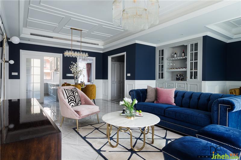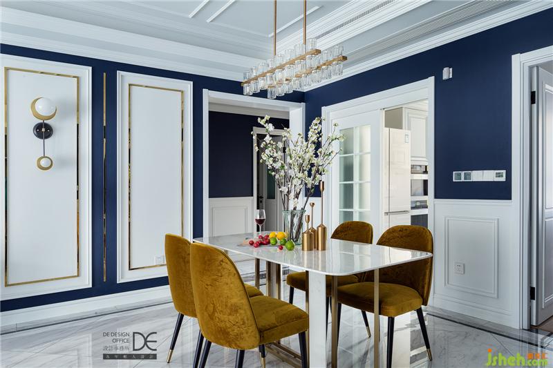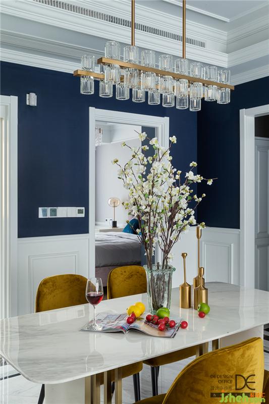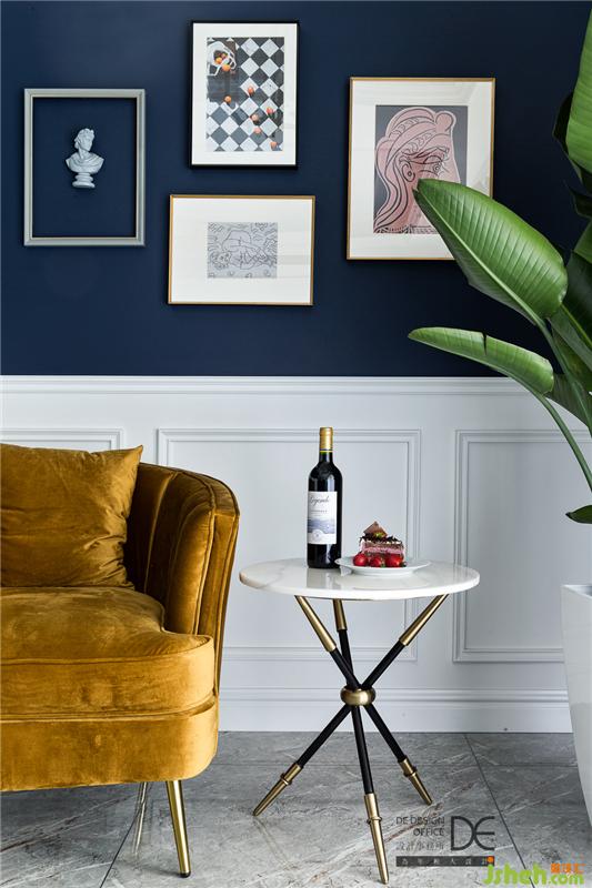 打開門,映入眼簾的便是一種時尚感?;疑男?,深藍(lán)色、白色與金色的撞色,讓空間色彩豐富卻絲毫不顯俗氣。