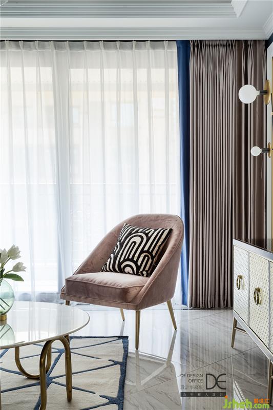 客廳的窗簾用色整體素雅和諧。橫平豎直的空間線條里,絲綢質(zhì)感的窗簾提升了空間的質(zhì)感。絲絨、金屬、石材等材質(zhì)亦悄然置入,美式與輕奢風(fēng)格大膽融合,相得益彰。