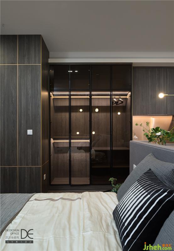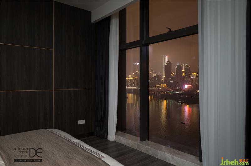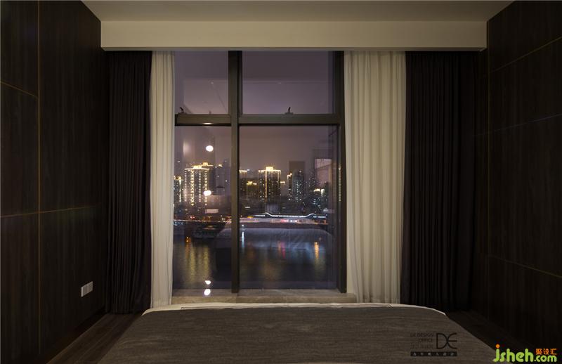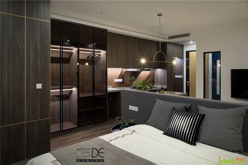 臥房區(qū)域有著極好的視野,晚上可以盡情欣賞窗外的燈火闌珊,早上也可以感受清晨的第一縷陽(yáng)光。連接櫥柜的區(qū)域是一面開(kāi)放式的衣柜,完全足夠放下夫婦二人暫居的衣物。