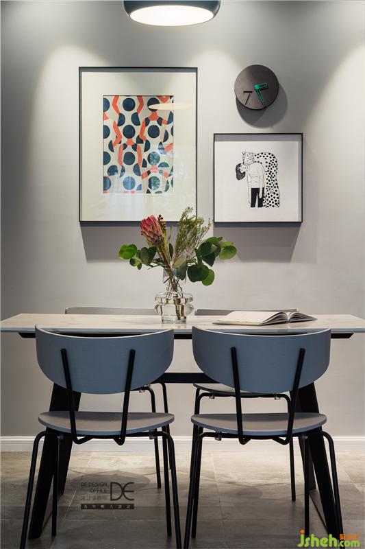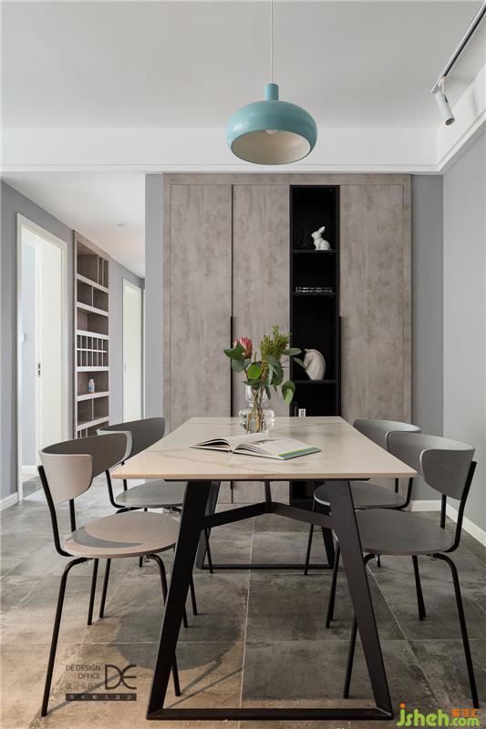 大理石紋理的餐桌搭配水泥色的地磚,簡(jiǎn)潔明朗。餐廳的柜子保留了現(xiàn)代的寂靜,孔雀藍(lán)的燈具更是點(diǎn)睛之筆,為餐廳增添了一份特有的溫馨之感。