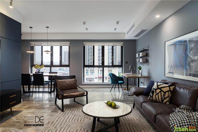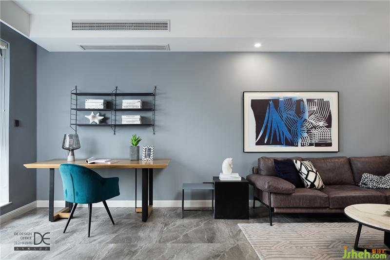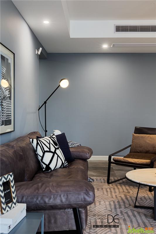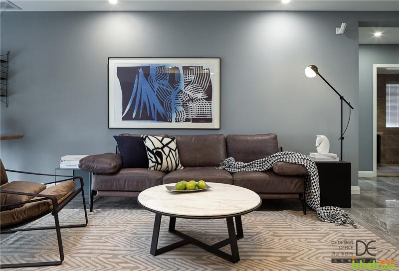 灰藍(lán)色的墻面與中灰色系的地面碰撞在一起,閑適中彰顯出屋主的穩(wěn)重,深咖色的沙發(fā)與黑色的邊幾是在活躍的硬裝設(shè)計(jì)上搭配的較為冷靜的軟裝配色,整個(gè)客廳宛如微風(fēng)吹拂下泛起縷縷漣漪的藍(lán)色大海。
