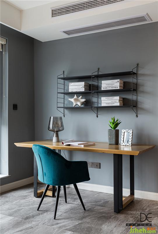 與客餐廳一起的開(kāi)放式書(shū)房在藍(lán)色座椅和鐵藝置物架的點(diǎn)綴下,簡(jiǎn)單又不失清新之感,使得整個(gè)空間和諧而不失調(diào)性。