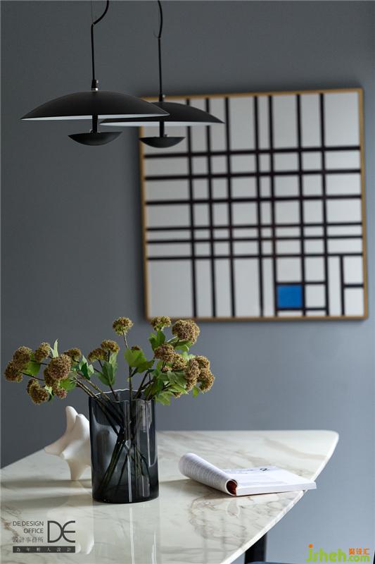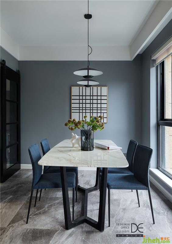 餐廳作為與客廳同一空間不同功能的存在,色彩搭配與客廳有異曲同工之妙;餐桌采用白色大理石與黑色撞色,彰顯霸氣且不側(cè)漏,再配上與墻面呼應(yīng)的藍(lán)色餐椅,時(shí)時(shí)處處緊密相連、環(huán)環(huán)相扣。