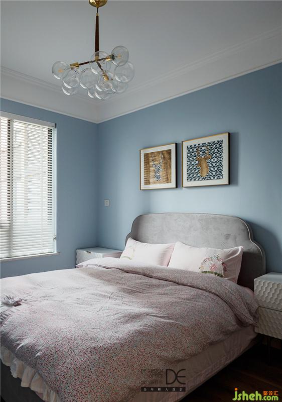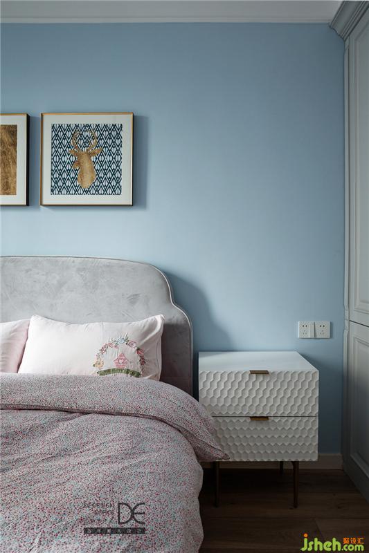 另一間臥室主打溫柔舒適的藍(lán)色,用簡(jiǎn)約的床頭柜、精致的掛畫(huà),營(yíng)造出放松的休憩環(huán)境。這個(gè)房間暫時(shí)作為次臥使用,不久后也會(huì)成為弟弟的專屬房間。