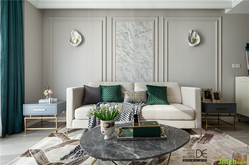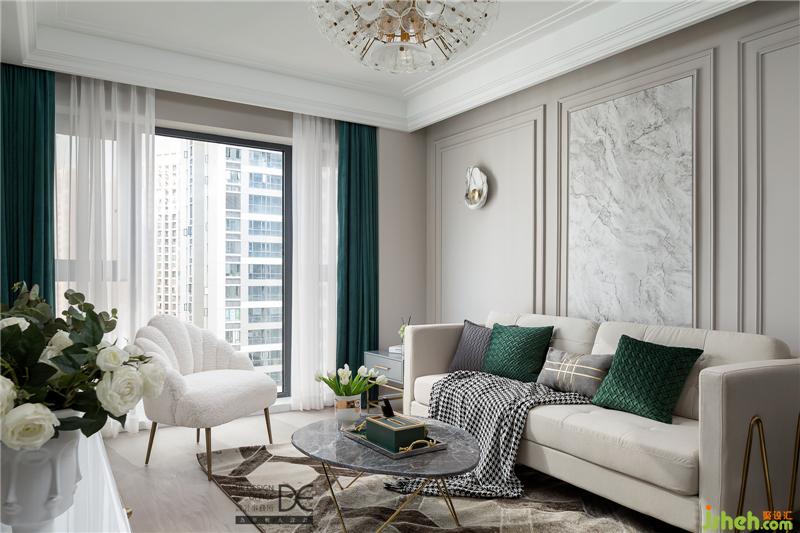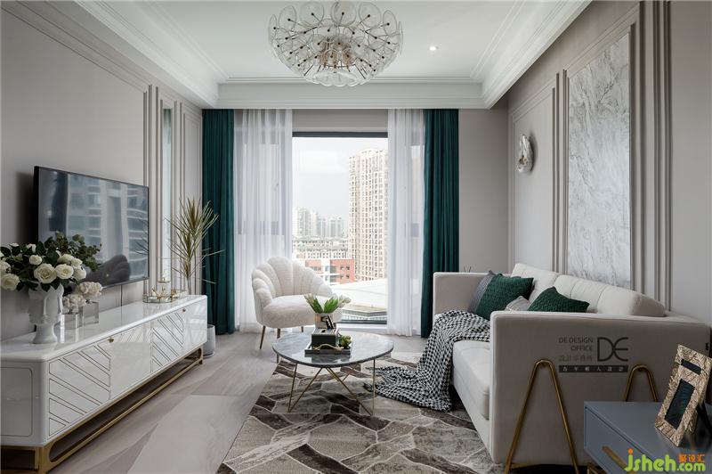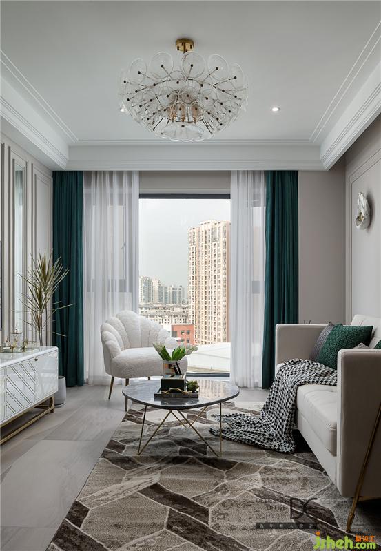 客廳精致的細(xì)節(jié)中透露出一絲浪漫的復(fù)古情調(diào),落地窗使光線貫穿著整個(gè)空間,看出去的視野開闊通透。