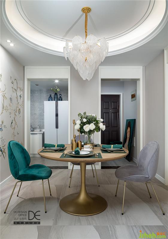 站在餐廳,可見門廳和廚房門洞的對稱處理,有線條的落樘門板搭配花鳥墻畫,彰顯餐廳的端穩(wěn)雅致,整個(gè)空間在花瓣吊燈的映襯下光韻流轉(zhuǎn),呈現(xiàn)著高貴的氣質(zhì)。