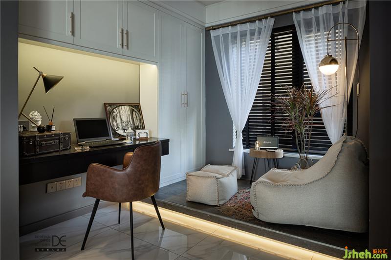 這里不僅有書房的功能,還保留了一個(gè)地臺(tái)作為休閑角落。設(shè)計(jì)師在地臺(tái)邊緣精心設(shè)計(jì)了燈帶,讓整個(gè)空間更具層次感的同時(shí),又增加了一絲浪漫之感。