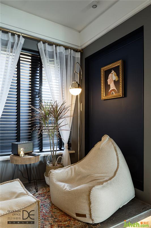 休閑角落以深藍(lán)色和灰色為主調(diào),落地?zé)羧岷偷墓猓由习偃~窗透出的絲絲光線,讓人只想在這里聽著音樂喝著咖啡,安安靜靜地享受精致的下午時(shí)光。