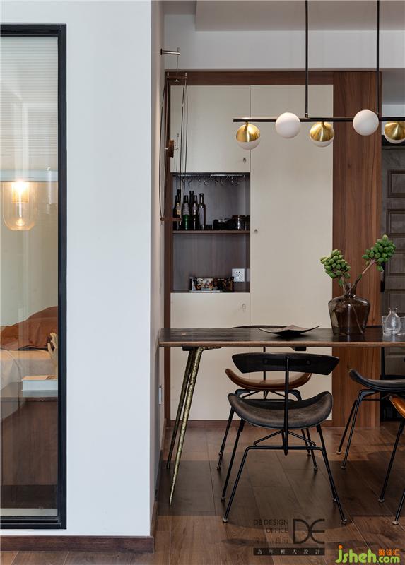 重慶室內(nèi)設計師選用白色打底,鋪上與家具類似的黑胡桃木色地板,做舊的餐桌為這個空間帶來一絲復古氣息。
