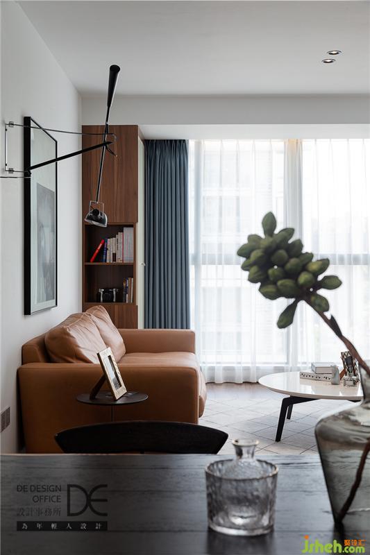 暗橙色的沙發(fā)是業(yè)主的心頭好,旁邊的柜體開口部分正好可以作為沙發(fā)旁的邊幾使用,方便業(yè)主在沙發(fā)上也能隨手放置和拿取書籍物件。