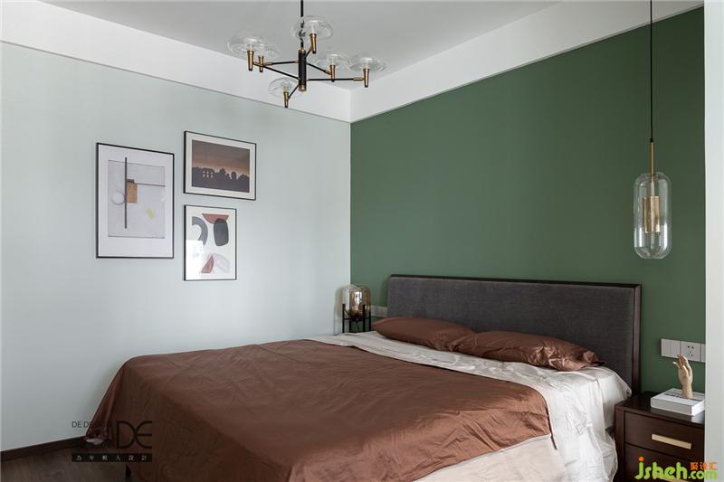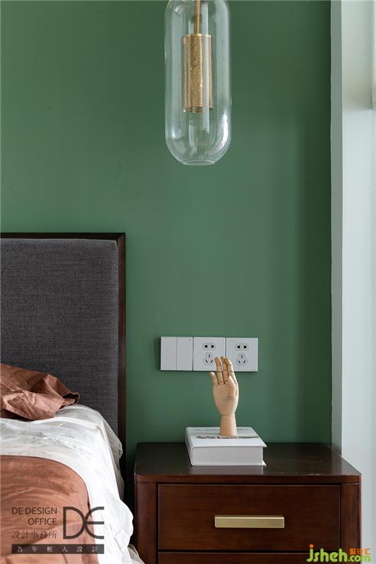 主臥主打復(fù)古調(diào)的綠色,玻璃金屬質(zhì)感的床頭燈與主燈相呼應(yīng),營造精致而不失夢幻的睡眠空間。