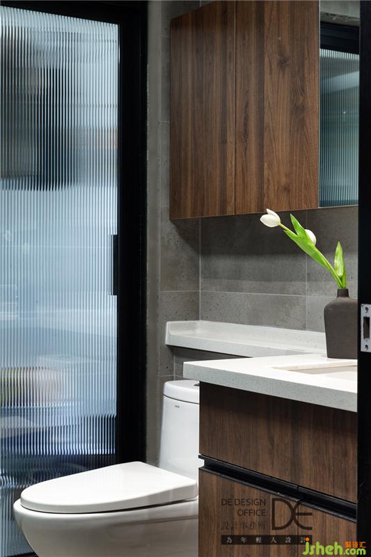 衛(wèi)浴空間緊湊實用,與廚房相呼應(yīng)的柜體豐富了儲物空間,連通生活陽臺的滑門設(shè)計增加了空間的通透感。