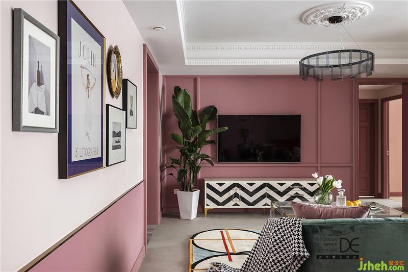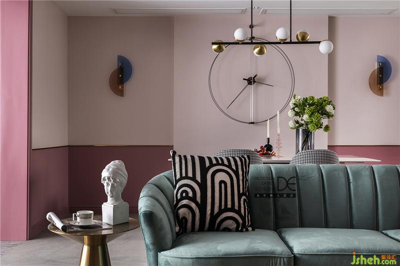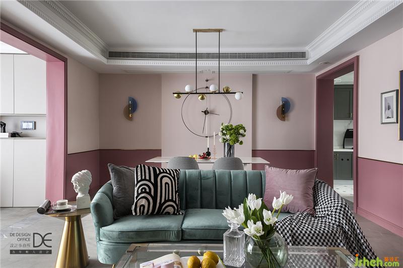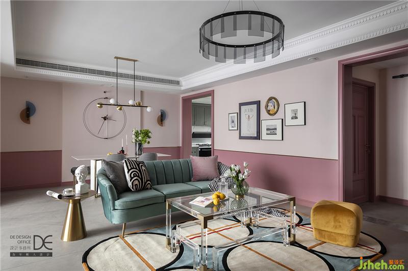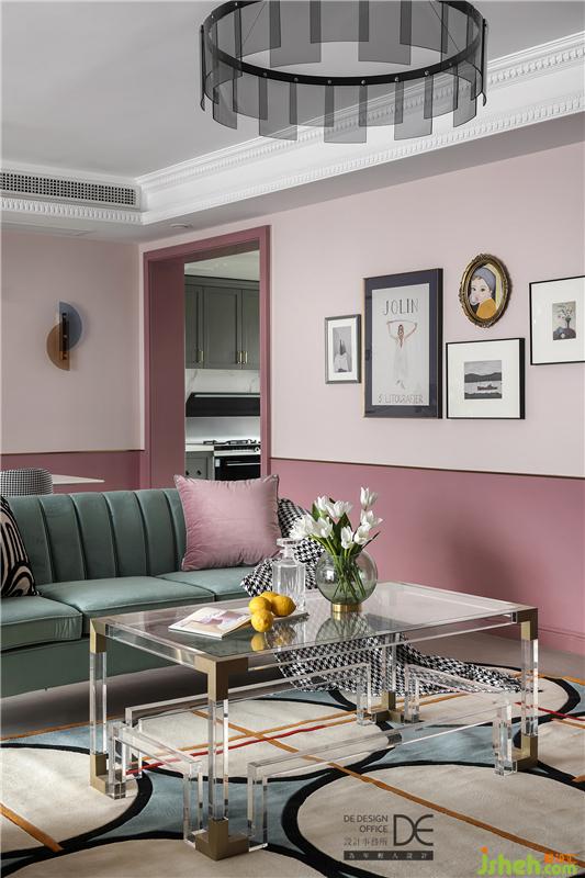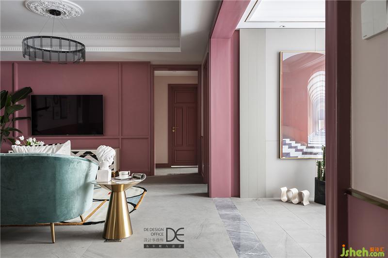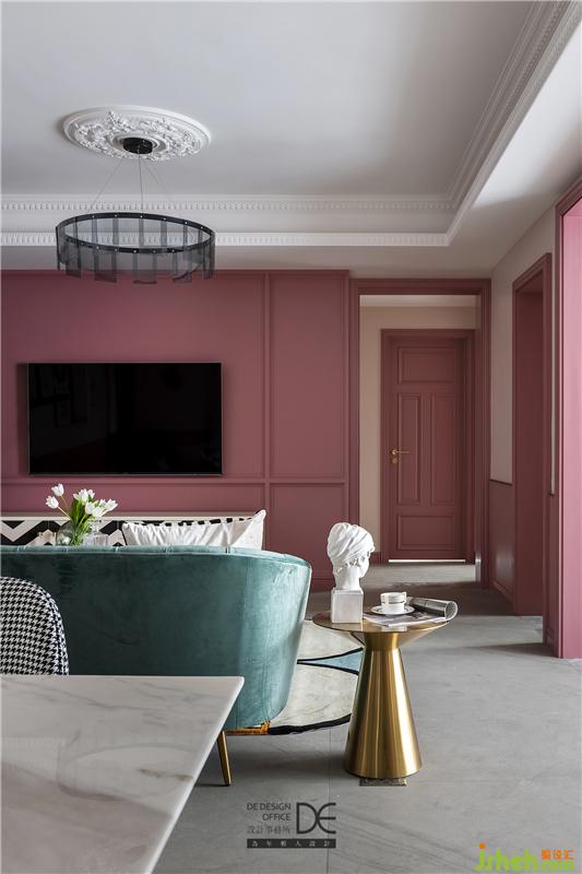 不同層次的柔玫瑰粉在不同的區(qū)域有序跳動(dòng),似乎有著某種節(jié)奏,晶瑩剔透的茶幾和透明質(zhì)感的吊燈相呼應(yīng),整個(gè)空間層次分明,搭配藍(lán)色沙發(fā)給人視覺上的跳躍感,讓粉色不再單調(diào)。