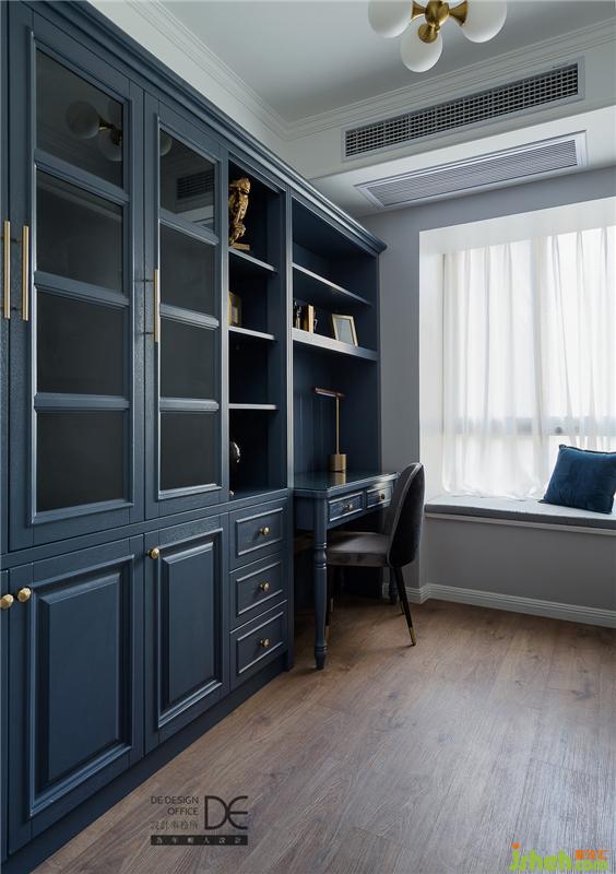 書房區(qū)域也沿續(xù)了業(yè)主非常喜歡的灰藍(lán)色。書桌是可移動(dòng)的,可以放置到自己想要的位置。書柜運(yùn)用了開放格和玻璃門的裝修設(shè)計(jì),方便擺放和陳列業(yè)主心愛的收藏品,整個(gè)空間看起來也更加的通透靈動(dòng)。