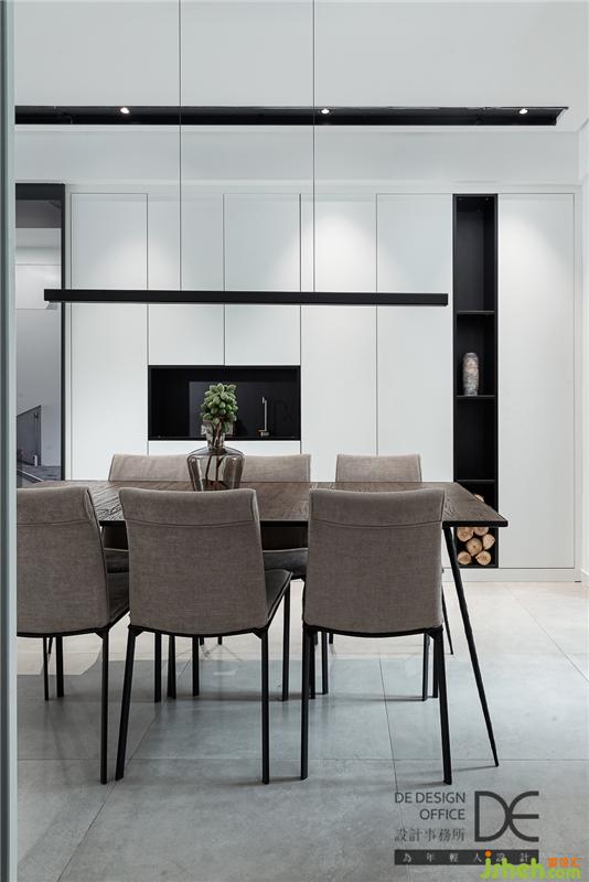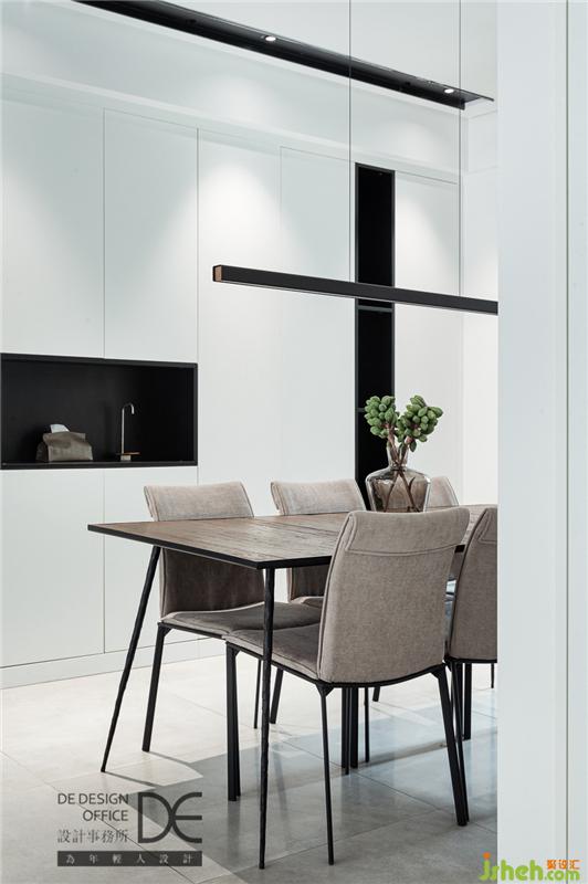 考慮到生活的便利性,設計師巧妙地將直飲水龍頭藏于餐廳柜子的開放架中。