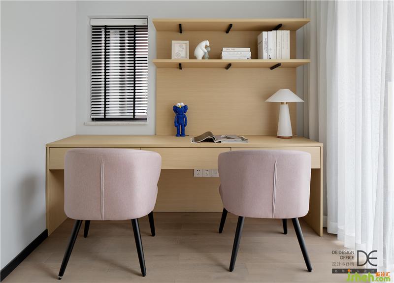 簡(jiǎn)單純粹的原木色,重慶裝修設(shè)計(jì)讓工作和學(xué)習(xí)變得輕松舒適,粉色單椅的加入,增加了書(shū)房的溫馨之感。