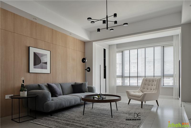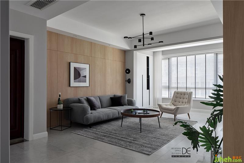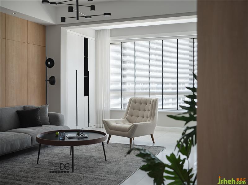 灰色布藝沙發(fā)和灰色地毯提升客廳空間的質(zhì)感,米白色休閑沙發(fā)椅讓空間更加溫和;白色的收納柜滿足了大量的儲(chǔ)物需求,讓空間整潔有序;簡(jiǎn)潔的木飾面板輔以一幅色塊分明的裝飾畫(huà)做點(diǎn)綴,沙發(fā)旁邊的圓形落地?zé)舻榷甲尯?jiǎn)約的空間更加豐滿。