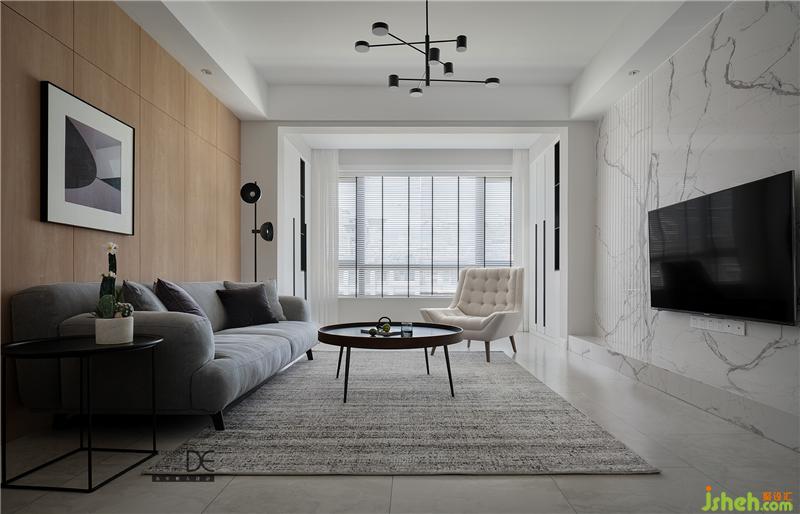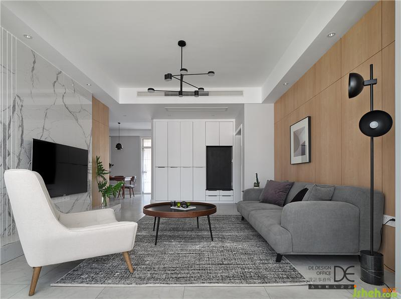 明亮整潔的客廳總是令人眼前一亮。為了保證整體空間的層高,客廳采用邊吊,搭配造型吊燈,簡(jiǎn)單明了;爵士白大理石電視墻搭配沙發(fā)后面的木飾面板,空間感覺(jué)恰到好處;木飾面板拼接的自然縫隙和大理石墻面的拉縫處理得當(dāng),一密一疏,張弛有度,增添了美感,更豐富了客廳空間的層次;落地玻璃窗戶的裝修設(shè)計(jì)還給空間增添了足夠的采光。